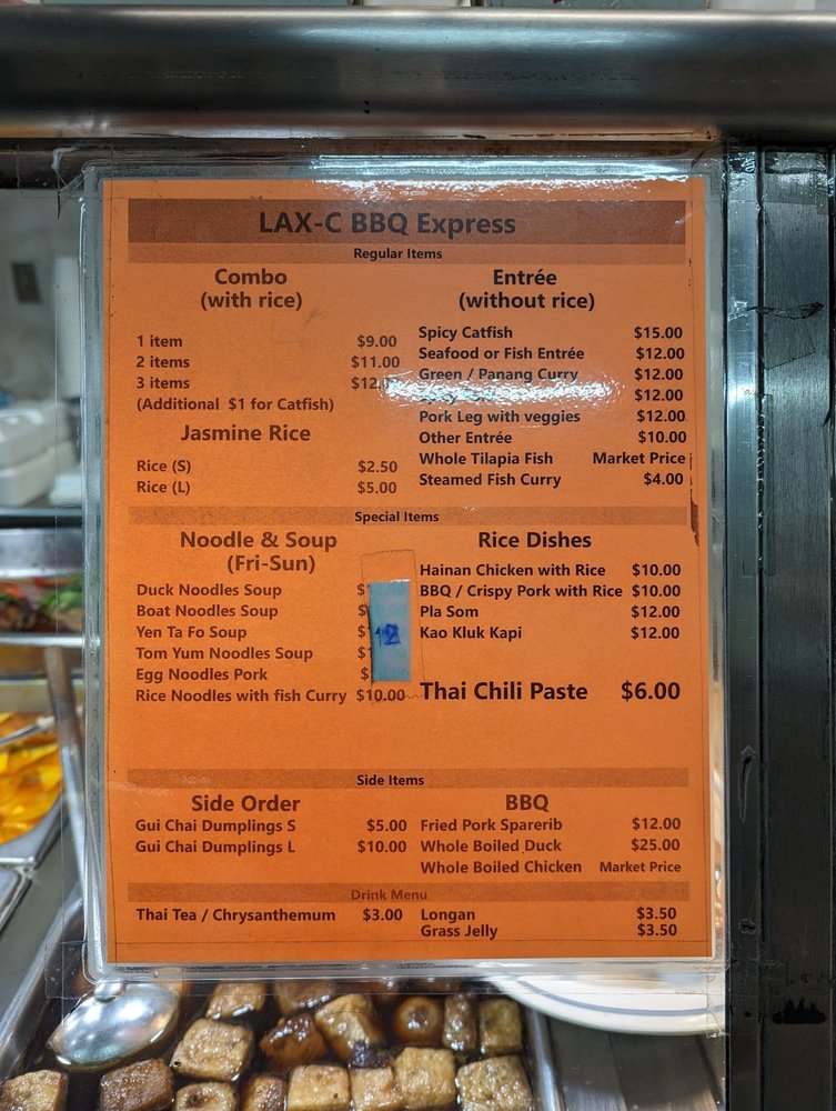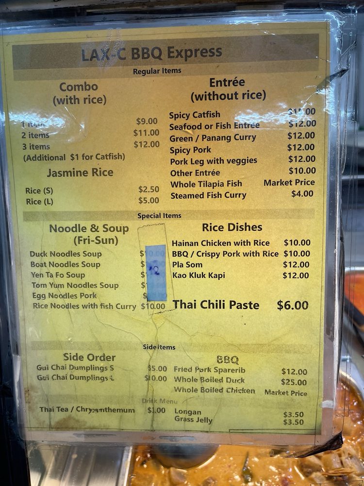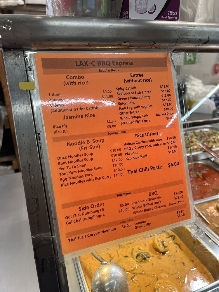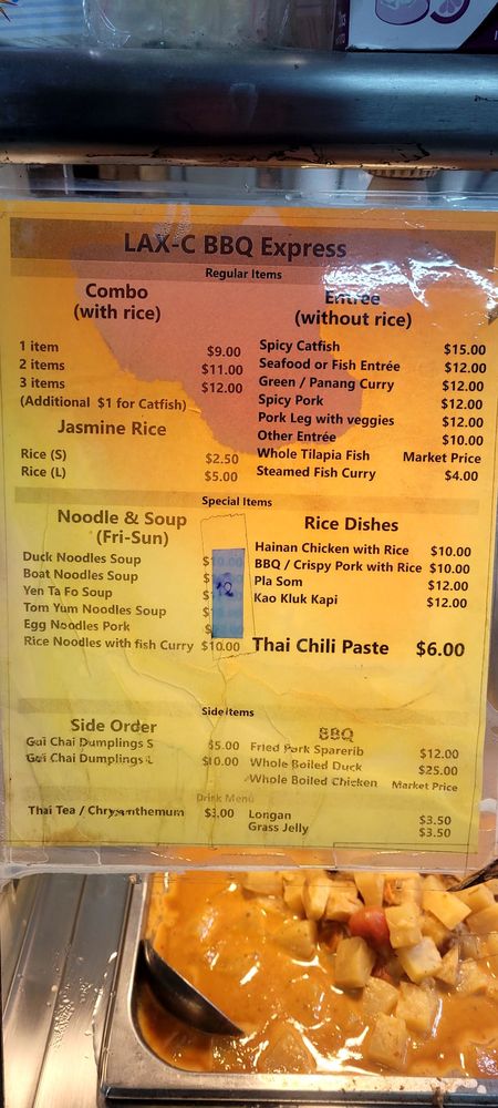 Introducing the menu at LAX-C, a wholesale store offering a wide array of authentic Thai groceries and ingredients. Located in Los Angeles, this Thai Costco provides a unique shopping experience for those seeking quality Asian products. Customers rave about the extensive selection, including halaya ube jam, Thai tea, and various spices. The on-site restaurant offers delicious Thai dishes at affordable prices, with combos starting at $11. Don't miss the mango coconut cake and BBQ skewers in the parking lot. LAX-C is a hidden gem for Asian cuisine enthusiasts looking to stock up on pantry essentials. Make sure to check out the food vendors on weekends for a taste of authentic Thai cuisine. Don't forget to explore the neighboring Thai tea boba shop for refreshing beverages. Experience the bustling atmosphere and find everything you need for your next Asian-inspired meal at LAX-C.